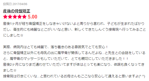 - 産後に骨盤の歪みや腰痛に悩まされていたが、骨盤を調整してもらったことで、歪みも痛みも感じなくなり楽に過ごせるようになった!