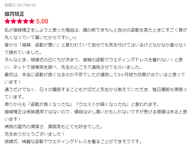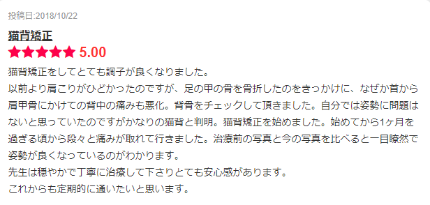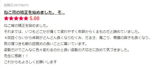 - 首が前出て自分の姿勢の悪さが前々から気になっていて、鏡を見るのも嫌だったが、施術後は背筋がピンと伸び、姿勢に自信が持てるようになった!