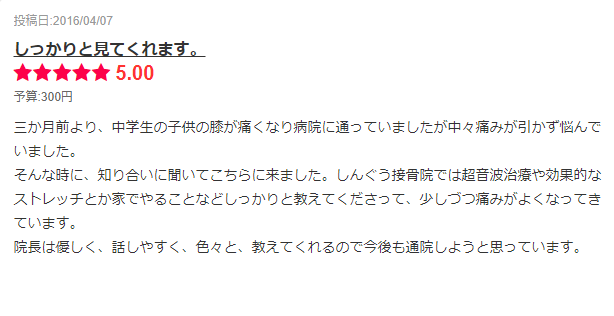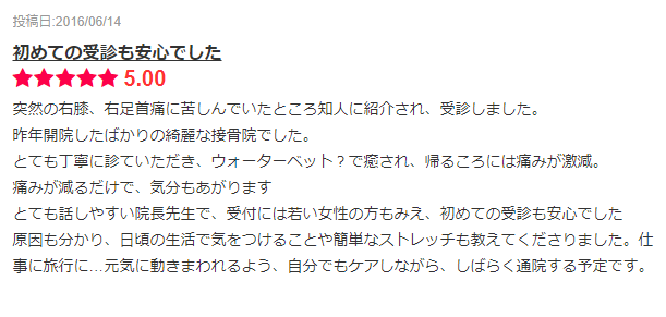 - 歩く度に、膝の裏から足の裏にかけて突っ張る感じがしていて、ヘルニアかもしれないと不安だったが、施術後は足の突っ張りが無くなり、これはヘルニアでは無いんだと安心できた!