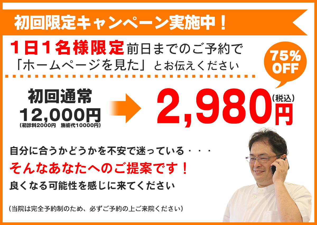 現在のあなたにとって必要なものは何なのかを知り、早めに施術をして、早く治して頂く、そのための特別価格です。