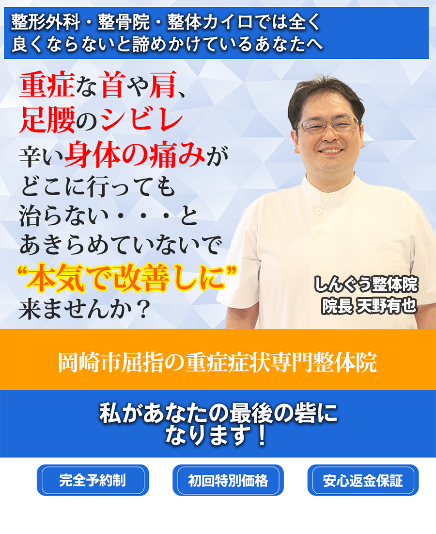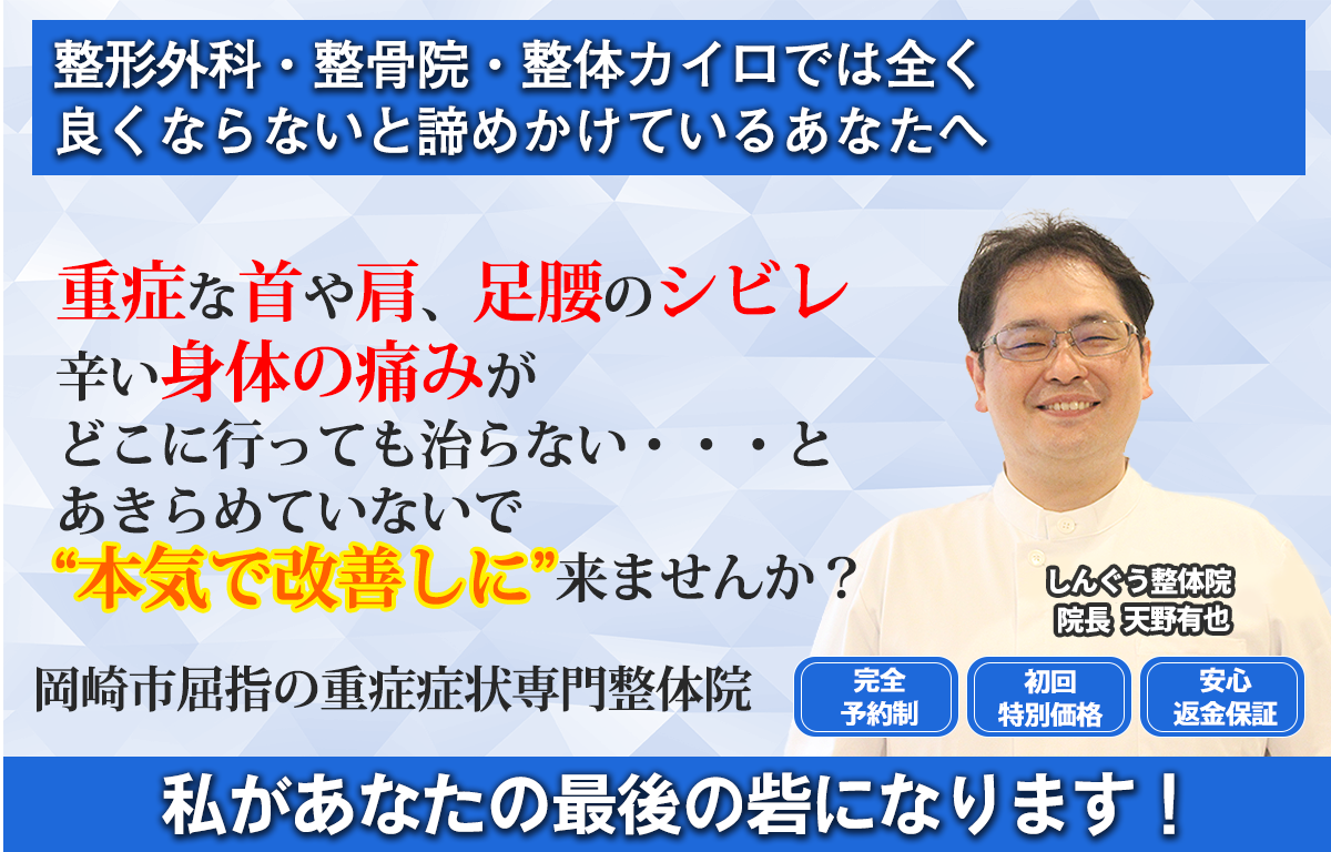 現在あなたが我慢しているその痛みを確実に改善に導く岡崎市で唯一の『重症症状専門院』しんぐう整体院に通院し、生涯痛みに悩むことのない人生を手に入れる道