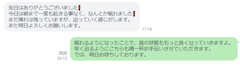 A.施術を受けるたびに、どんどん体が楽になり、痛みやしびれ等も良くなり、ここに来て、先生のおかげで大変助かりました。